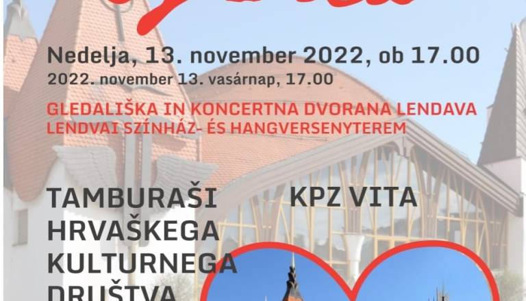 Nedelja, 13. november 2022, ob 17.00 KONCERT: Lendavi iz srca Nastopajo: Tamburaši Hrvaškega kulturnega društva Pomurje in Komorni pevski zbor Vita iz Lendave ...
