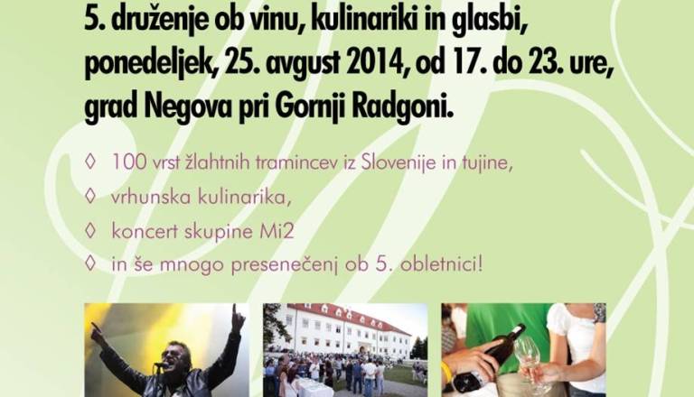Vabljeni na 5. druženje ob vinu, kulinariki in glasbi, ki bo potekalo 25.8. od 17 ure naprej. Čaka vas 100 vrst žlahtnih tramincev iz Slovenije in tujine ...