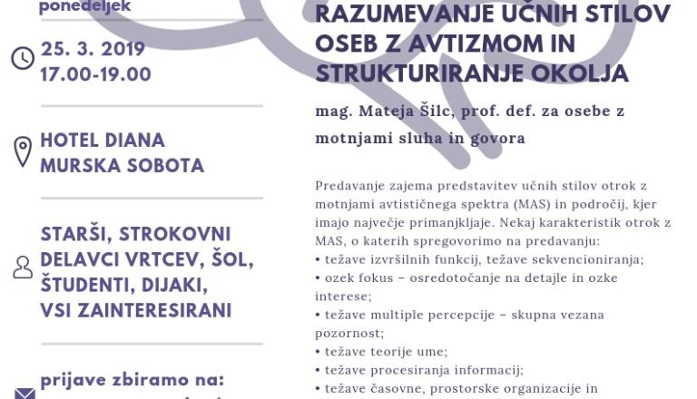 O predavanju: Predavanje zajema predstavitev učnih stilov otrok z motnjami avtističnega spektra (MAS) in področij, kjer imajo največje primanjkljaje. Nekaj ...