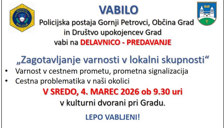VABILO Policijska postaja Gornji Petrovci, Občina Grad in Društvo upokojencev Grad vabi na DELAVNICO - PREDAVANJE „Zagotavljanje varnosti v lokalni skupnosti“ • ...