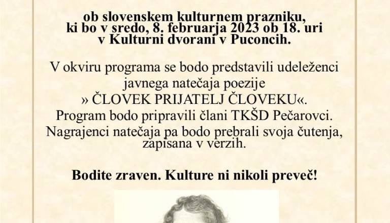 ZKTD Občine Puconci in Občina Puconci vabita na prireditev PRAZNIK KULTURE ob slovenskem kulturnem prazniku, ki bo v sredo, 8. februarja 2023 ob 18. uri v ...