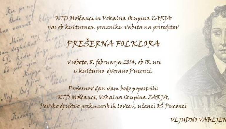 KTD Moščanci in Vokalna skupina Zarja vabita na prireditev PREŠERNA FOLKLORA, ki bo v soboto, 8.2., ob 18. uri v kulturni dvorani v Puconcih.