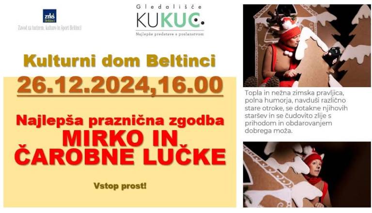 Gledališče Kukuc in ZTKŠ Beltinci vas 26. 12. 2024, ob 16.00 vabimo v Kulturni dom, na otroško božično predstavo Mirko in čarobne lučke. Gre za toplo in nežno ...