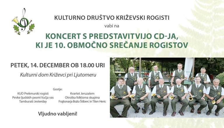 Kulturno društvo Križevski rogisti v petek, 14. decembra, ob 18. uri vabi na Koncert s predstavitvijo CD-ja, ki je 10. Območno srečanje rogistov. Dogodek bo ...