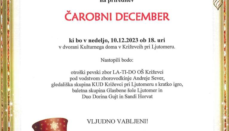 Z zimskim časom se nam približujejo najlepši prazniki v letu. VABIMO VAS na prireditev ČAROBNI DECEMBER, ki bo v nedeljo, 10.12.2023 ob 18. uri v dvorani ...
