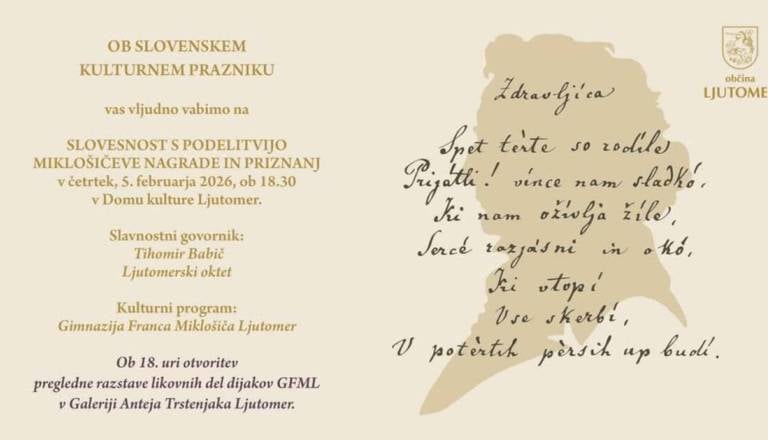 Osrednja občinska slovesnost ob slovenskem kulturnem prazniku bo v: četrtek, 5.02.2026 ob 18:30 v Domu kulture Ljutomer, Prešernova ulica 20, 9240 Ljutomer ...
