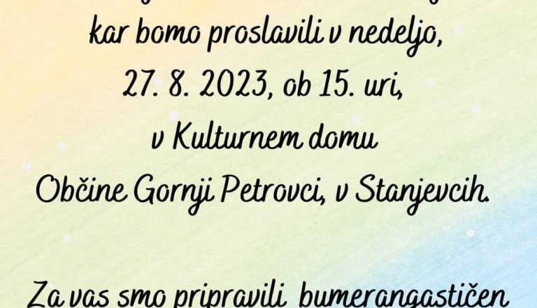 Društvo Bumerang Sreče vas vabi na prireditev ob 10. obletnici delovanja društva, ki bo v nedeljo, 27. 8. 2023 ob 15. uri, v Kulturnem domu v Stanjevcih ...
