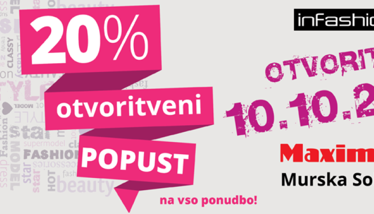 Vabljeni v Maximus Murska Sobota v novo trgovino INFASHION, kjer boste ta dan lahko nakupovali modna oblačila in obutev s kar 20% otvoritvenim popustom.