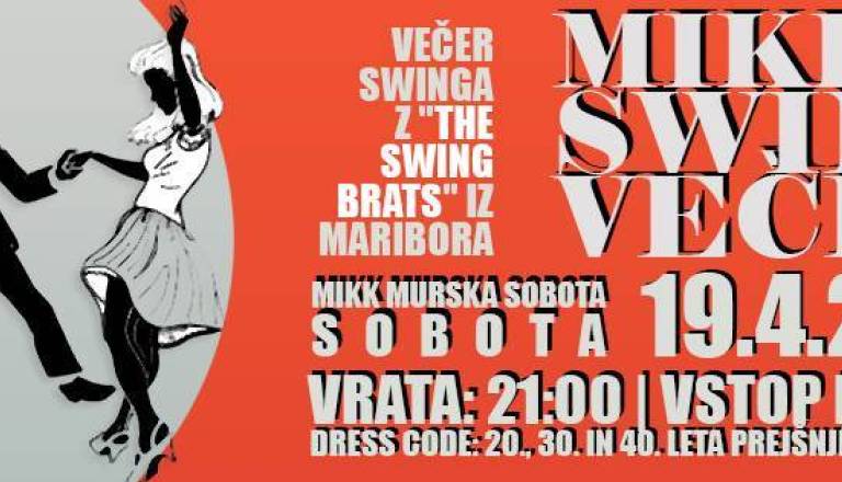 VEČER SWINGA Z "The Swing Brats" iz Maribora sobota 19.4.2014 vrata: 21:00 VSTOP PROST! DRESS CODE: 20., 30. in 40. leta prejšnjega stoletja! Mikk vas vabi, da ...