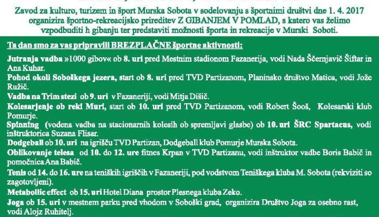 JUTRANJA VADBA ob 8.uri pred Mestnim stadionom Fazanerija. POHOD okoli Soboškega jezera, start ob 8. uri pred TVD Partizan. VADBA na Trim stezi ob 9. uri v ...