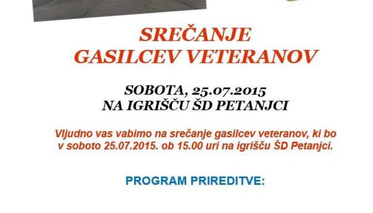 Vljudno vas vabimo na srečanje gasilcev veteranov POMURJA, ki bo v soboto 25.07.2015 ob 15:00 uri na igrišču ŠD Petanjci. Zabaval vas bo ansambel Opoj. Za hrano ...