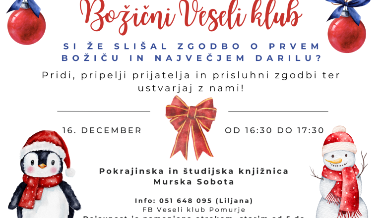V torek, 16. 12. 2025 ob 16:30 vabimo otroke, stare od 5 do 12 let na praznično, ustvarjalno in veselo druženje. Na delavnici bomo prisluhnili navdihujoči ...