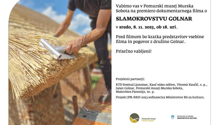 Vabimo vas v Pomurski muzej Murska Sobota na premiero dokumentarnega filma o SLAMOKROVSTVU GOLNAR v sredo, 8. 11. 2023, ob 18. uri. Pred filmom bo kratka ...