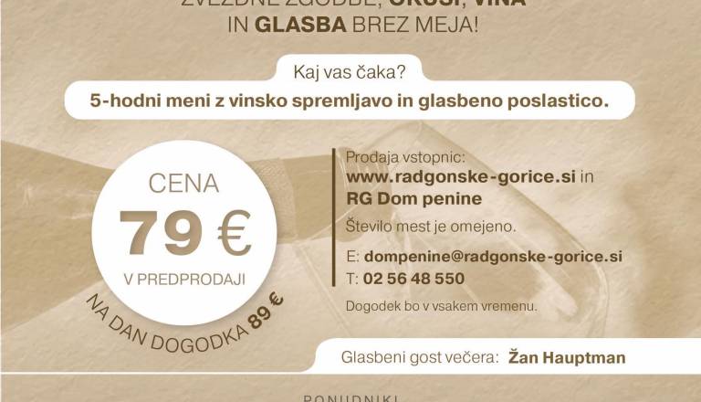 Pridružite se nam na čarobnem večeru v družbi ranine, avtohtone sorte Radgonsko-Kapelskega vinorodnega okoliša. Pričakuje vas bogata izbira vrhunskih vin ...