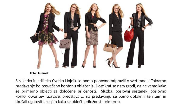 S slikarko in stilistko Cvetko Hojnik se bomo ponovno odpravili v svet mode. Tokratno predavanje bo posvečeno bontonu oblačenja. Dostikrat se nam zgodi, da ne ...