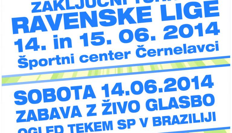Zaključni turnir Ravenske lige 14. in 15. junija v Športnem centru Černelavci. Zabava z živo glasbo, ogled tekem SP v Braziliji. Za jedačo in pijačo bo ...