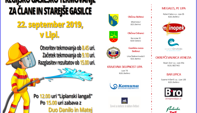 Spoštovani, vljudno Vas vabimo na izbirno gasilsko regijsko tekmovanje za člane in starejše gasilce, ki bo v nedeljo, 22. septembra 2019, v Športnem centru v ...