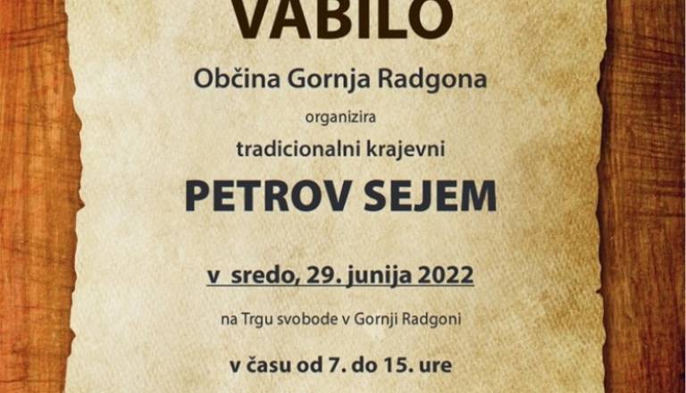 Tudi to leto bo na Trgu svobode v Gornji Radgoni potekal tradicionalni PETROV SEJEM, in sicer v sredo, 29. junija 2022, med 7.00 in 16.00. V ponudbi bodo ...