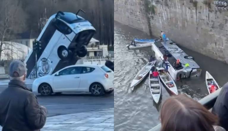 VIDEO: Avtobus prebil ograjo in končal v reki, voznik umrl na kraju