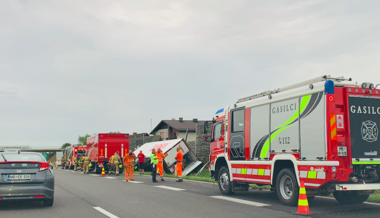 FOTO: Prometna nesreča na pomurski avtocesti, vozilo pristalo na boku