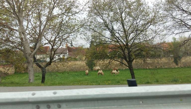 Ko med vožnjo po mestu pogledaš skozi okno, na zelenici pa se pasejo kamele