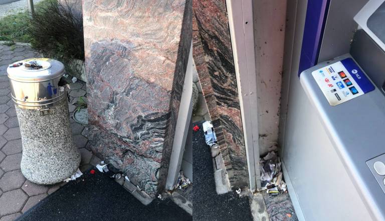 FOTO in VIDEO: Po zaprtju poslovalnice preostali bankomat le še gnusen prizor, kdo ga bo očistil?