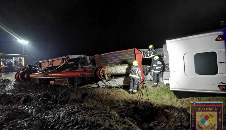FOTO: Prevrnil se je tovornjak z delovnim strojem, posredovali gasilci dveh društev