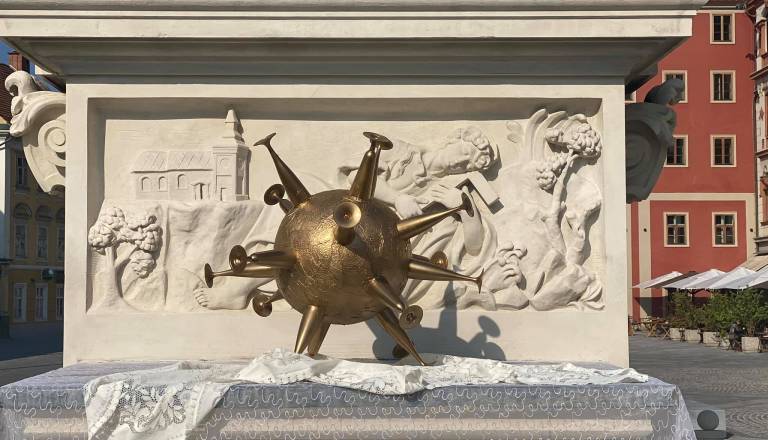 Na spomeniku v središču mesta postavili korona okrasek, ki pa se bo moral posloviti