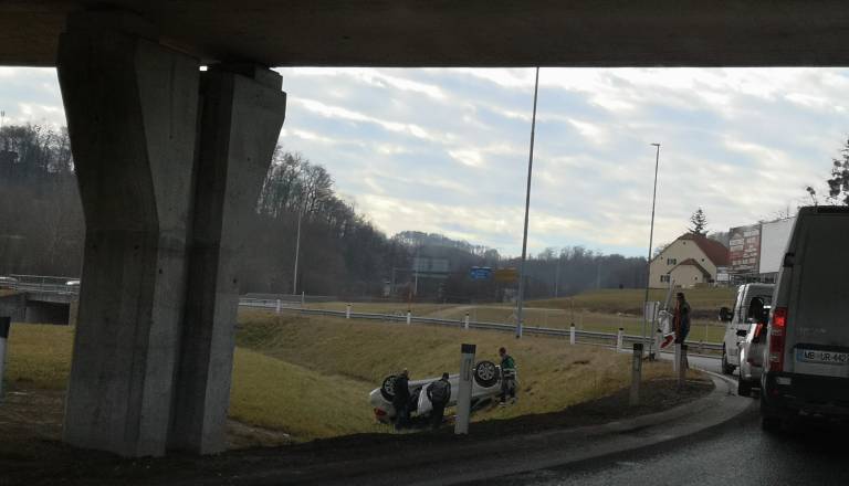 FOTO in VIDEO: V krožišču pri silosih zletel s ceste