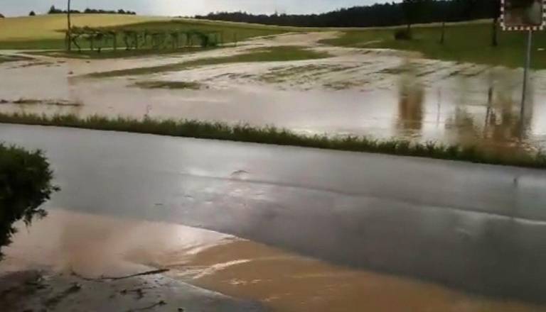 Huda ura v Pomurju: Zalite kleti in cestišča, veter podiral drevesa