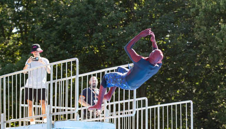 FOTO in VIDEO: Na soboškem kopališču izbirali najbolj atraktiven skok v bazen, med pogumneži tudi spiderman