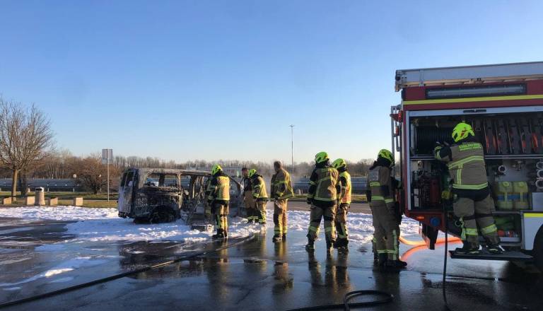 FOTO in VIDEO: Na avtocestnem počivališču zagorel kombi, posredovali so gasilci