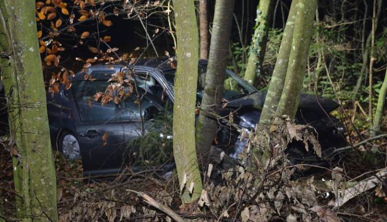 Zaletel se v drevo in ostal ukleščen v vozilu