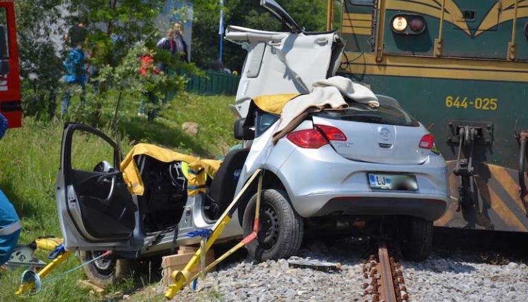 Vlak avto potiskal 100 metrov, voznik huje poškodovan