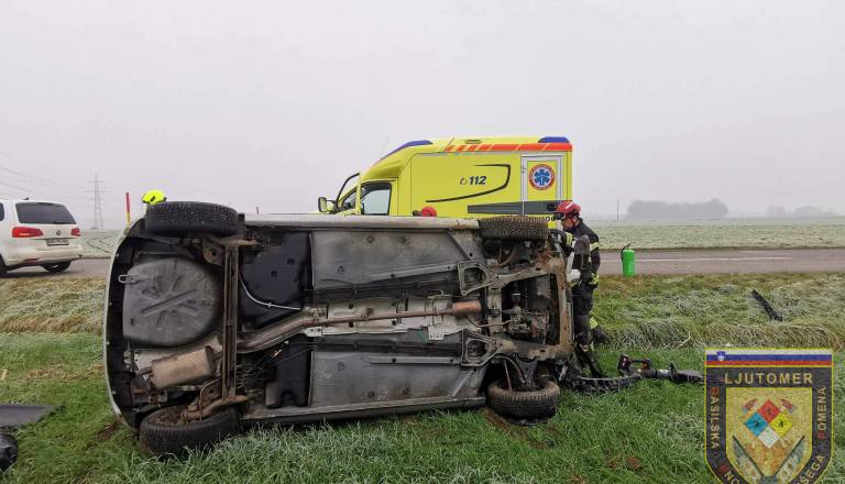 Nesreča na pomurski avtocesti: Vozilo zdrsnilo s cestišča in pristalo na strehi