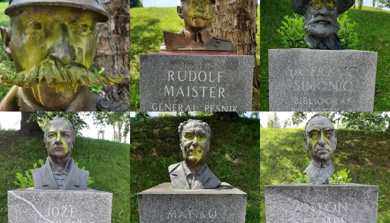FOTO: Saj ni res, pa je! Vandali v Pomurju z rumeno barvo nad osem kipov, knjige pristale v fontani