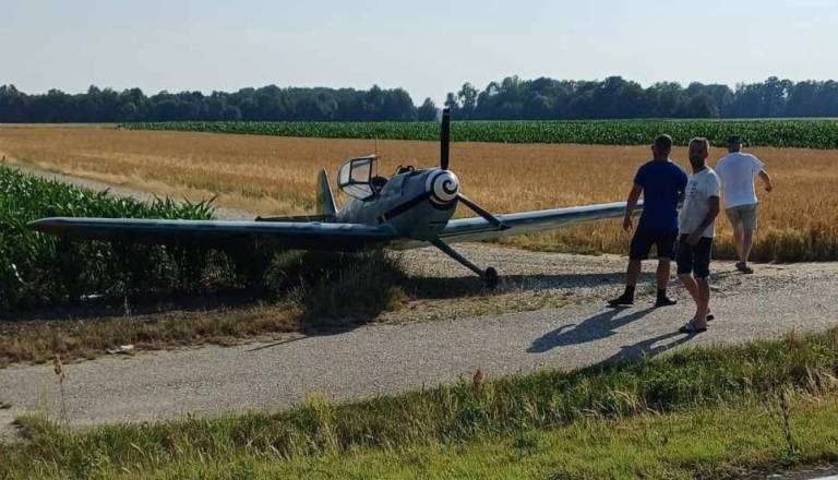 FOTO: Zasilni pristanek letala pri Odrancih: Gre za repliko iz druge svetovne vojne, to pa naj bi bil vzrok pristanka