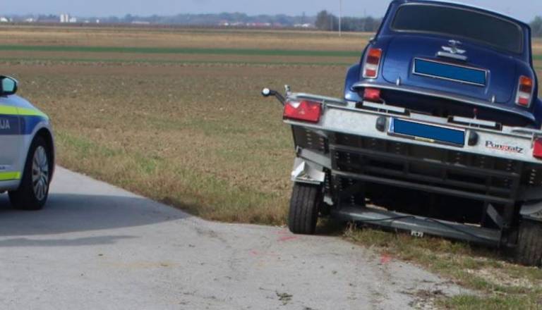 Izgubil prikolico z avtom, ki se je odpeljala čez kolesarsko stezo na njivo