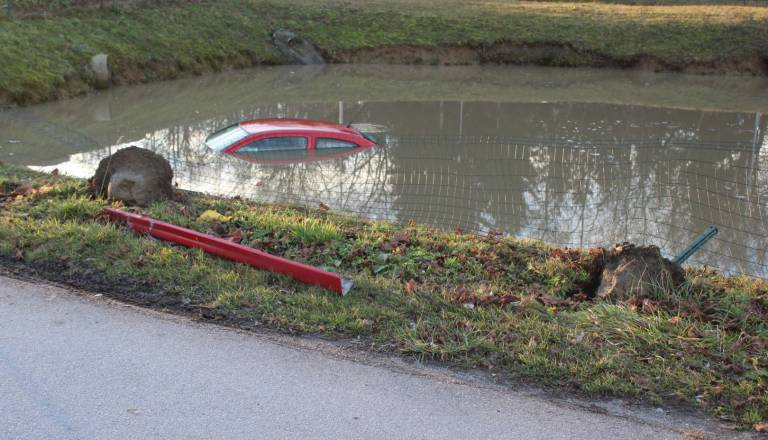 FOTO: Zapeljal s cestišča in pristal v zbiralniku vode, avto v celoti potonil