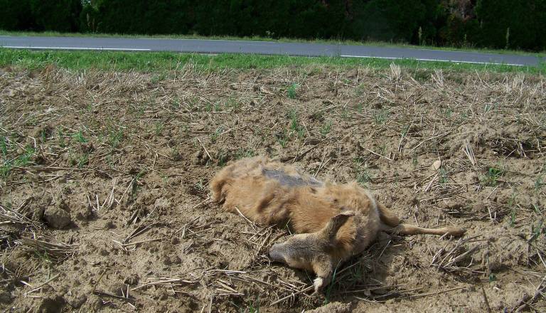 Poginula srna nekaj dni ležala na strnišču njive, pristojni so jo odpeljali šele po nekaj dneh