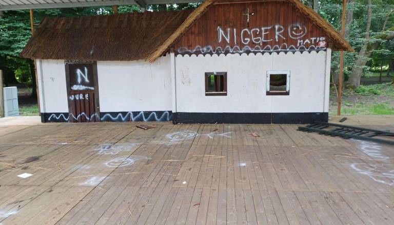 Zavržno dejanje v Beltincih: Neznanci z rasističnim napisom iznakazili občinski prireditveni prostor